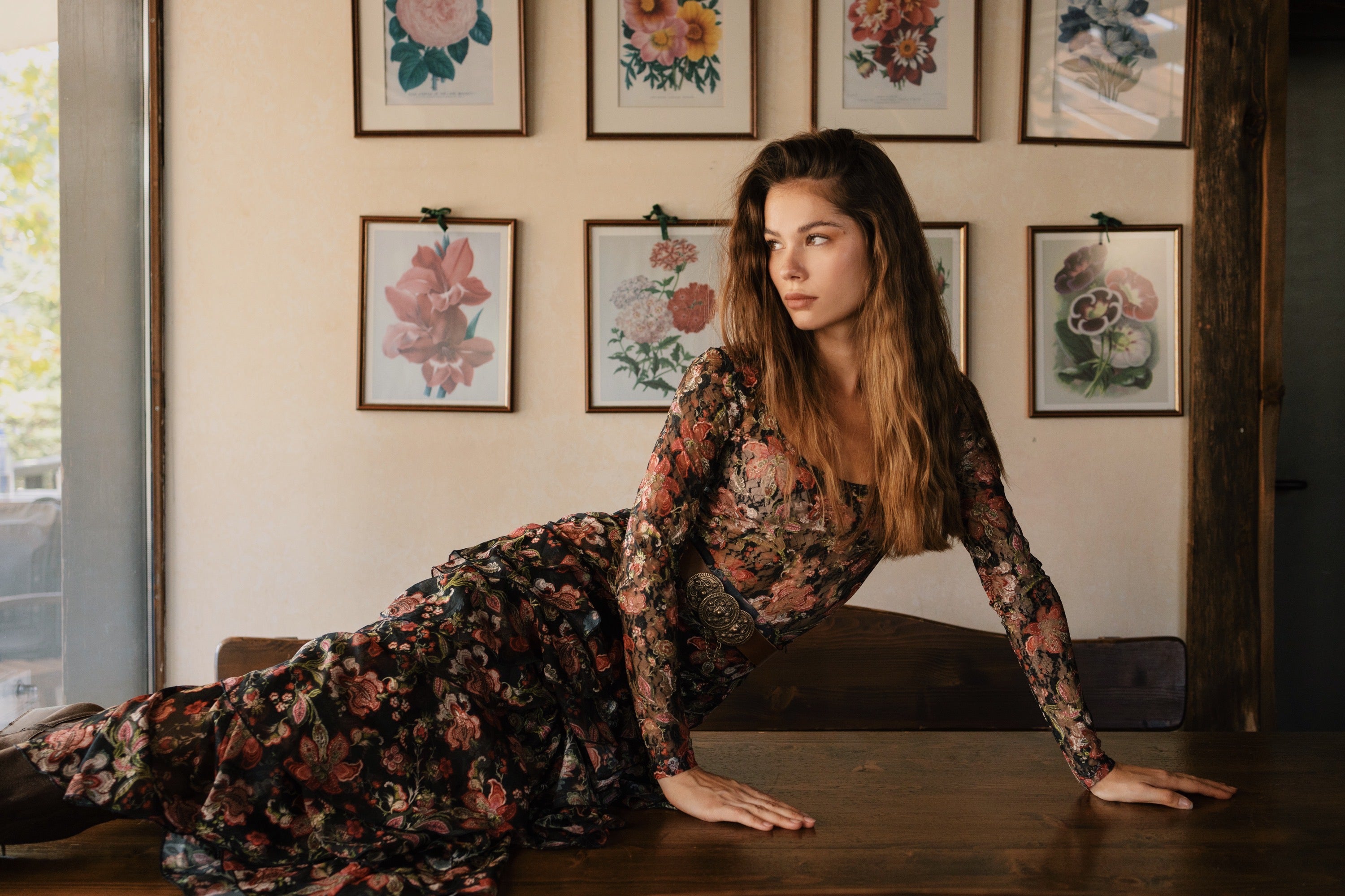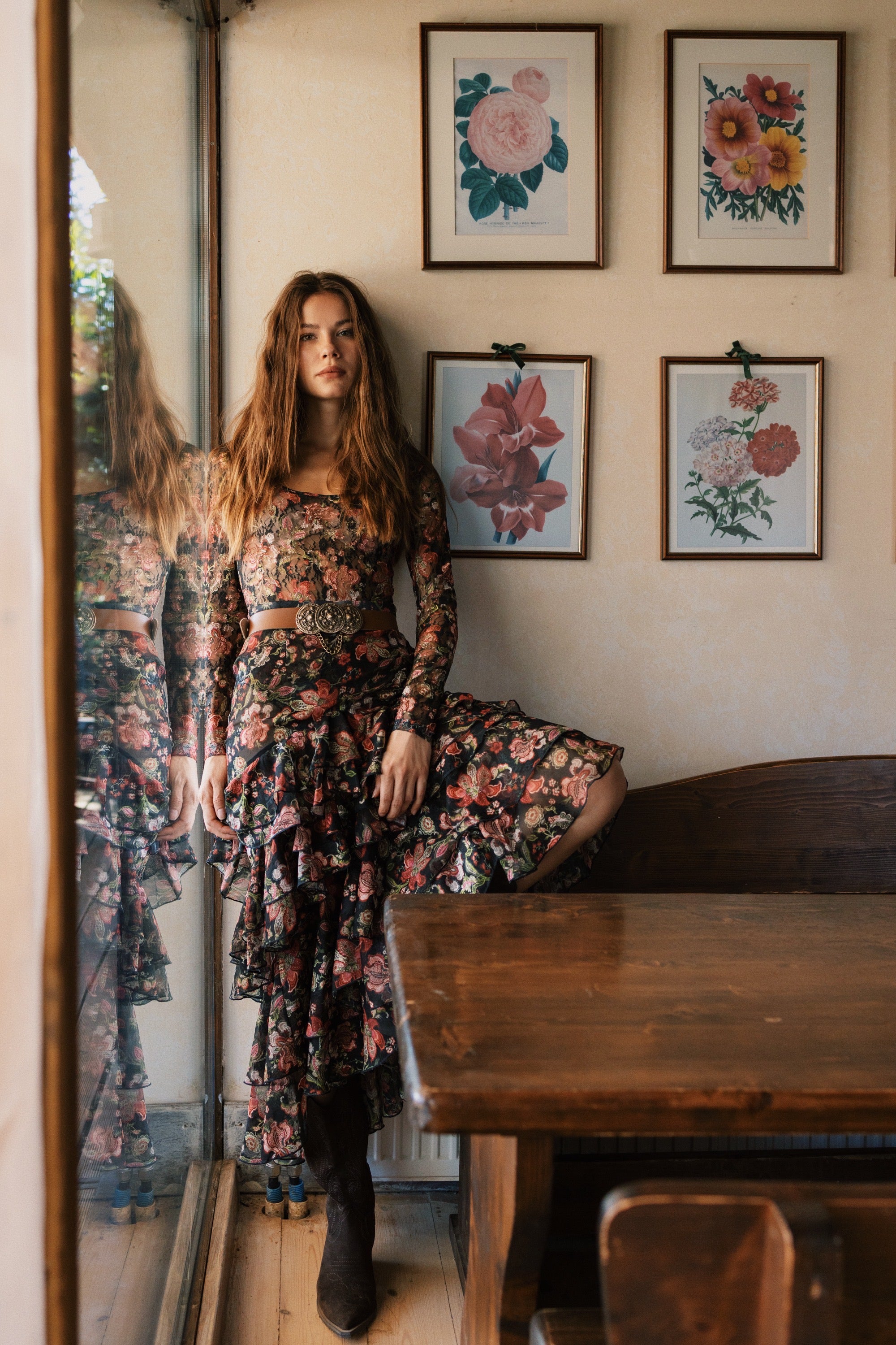 • Volant (tiered ruffle) hem for a flowing silhouette