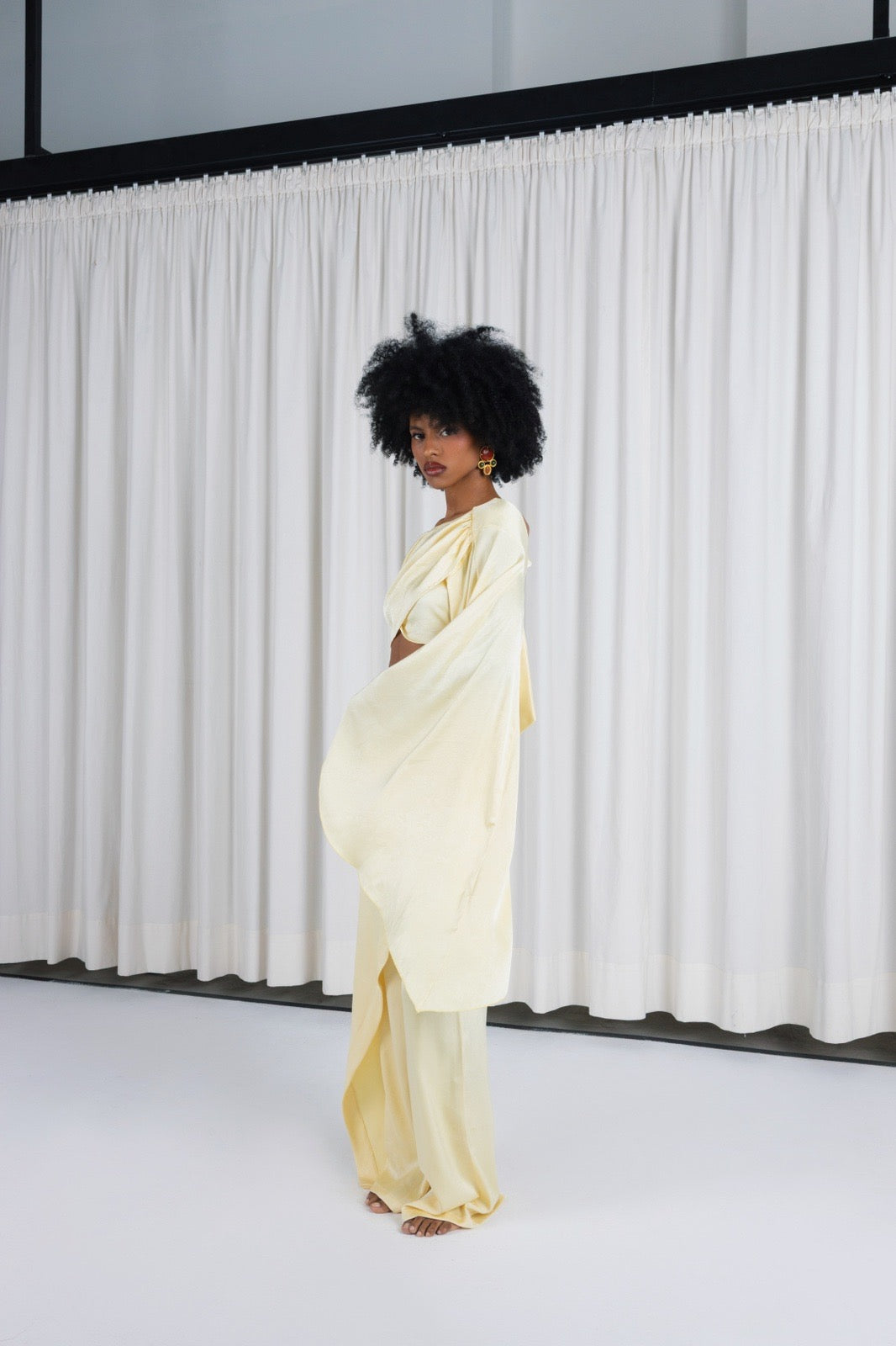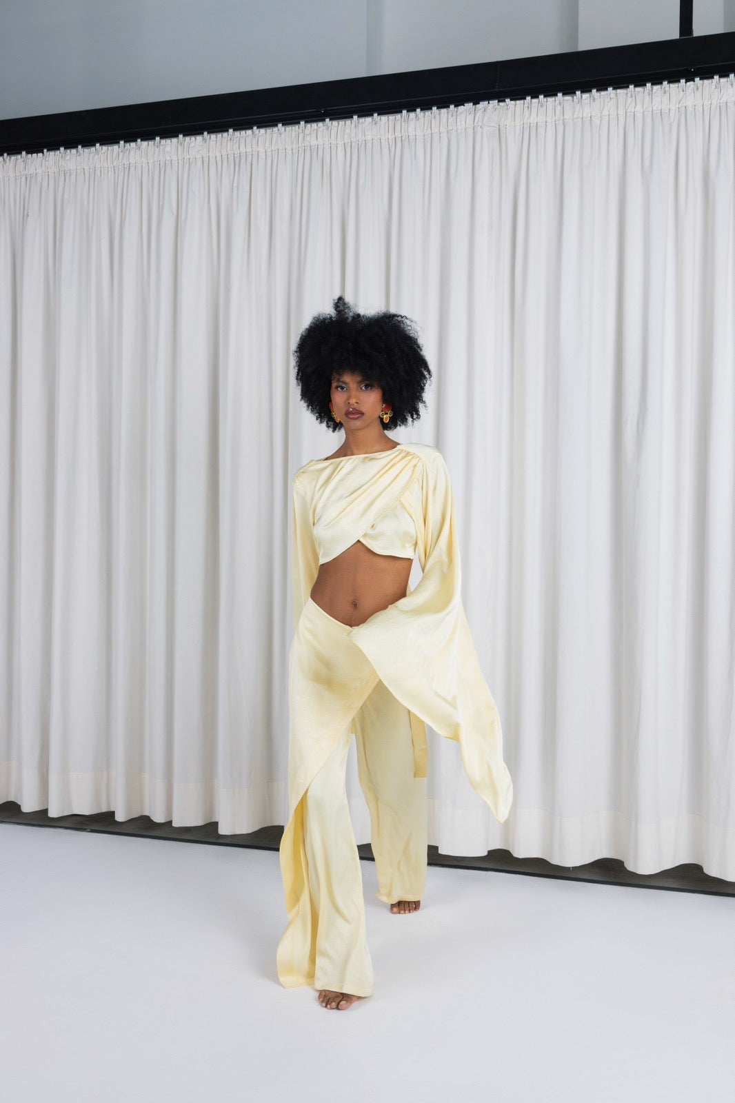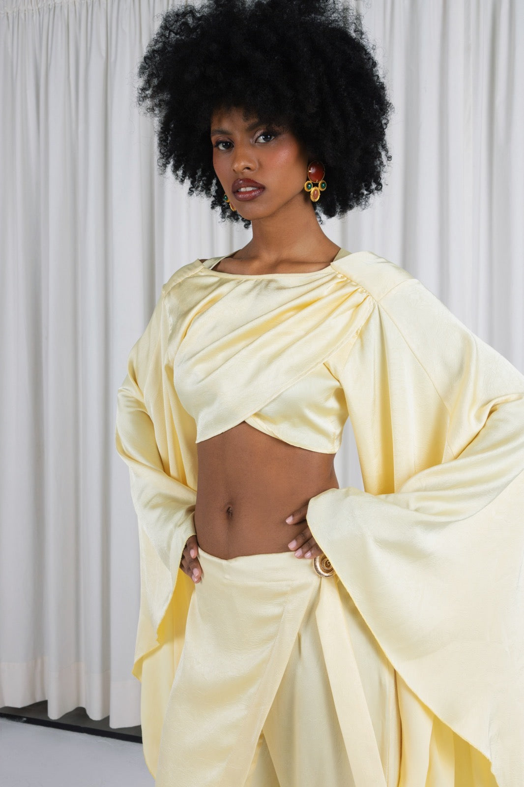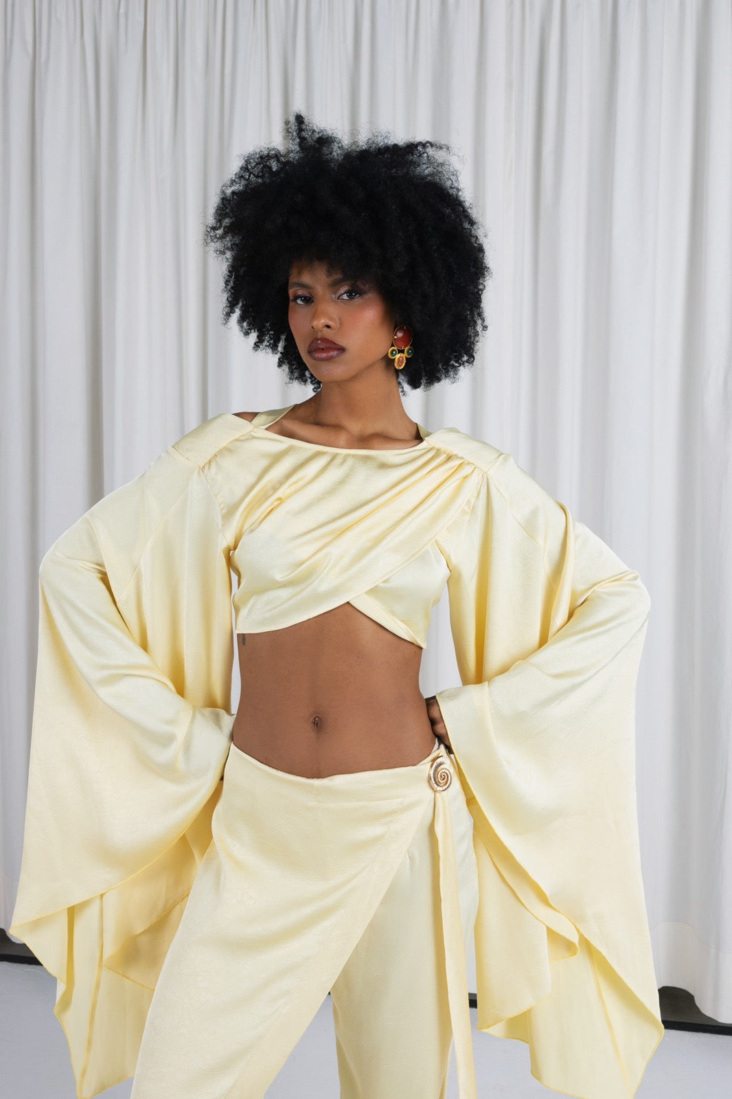 Cropped draped top with wide sleeves