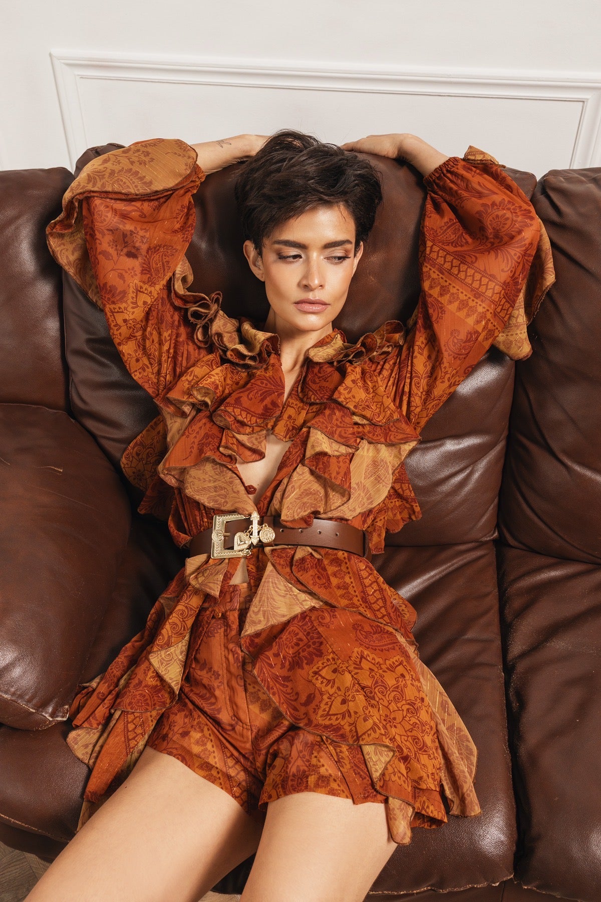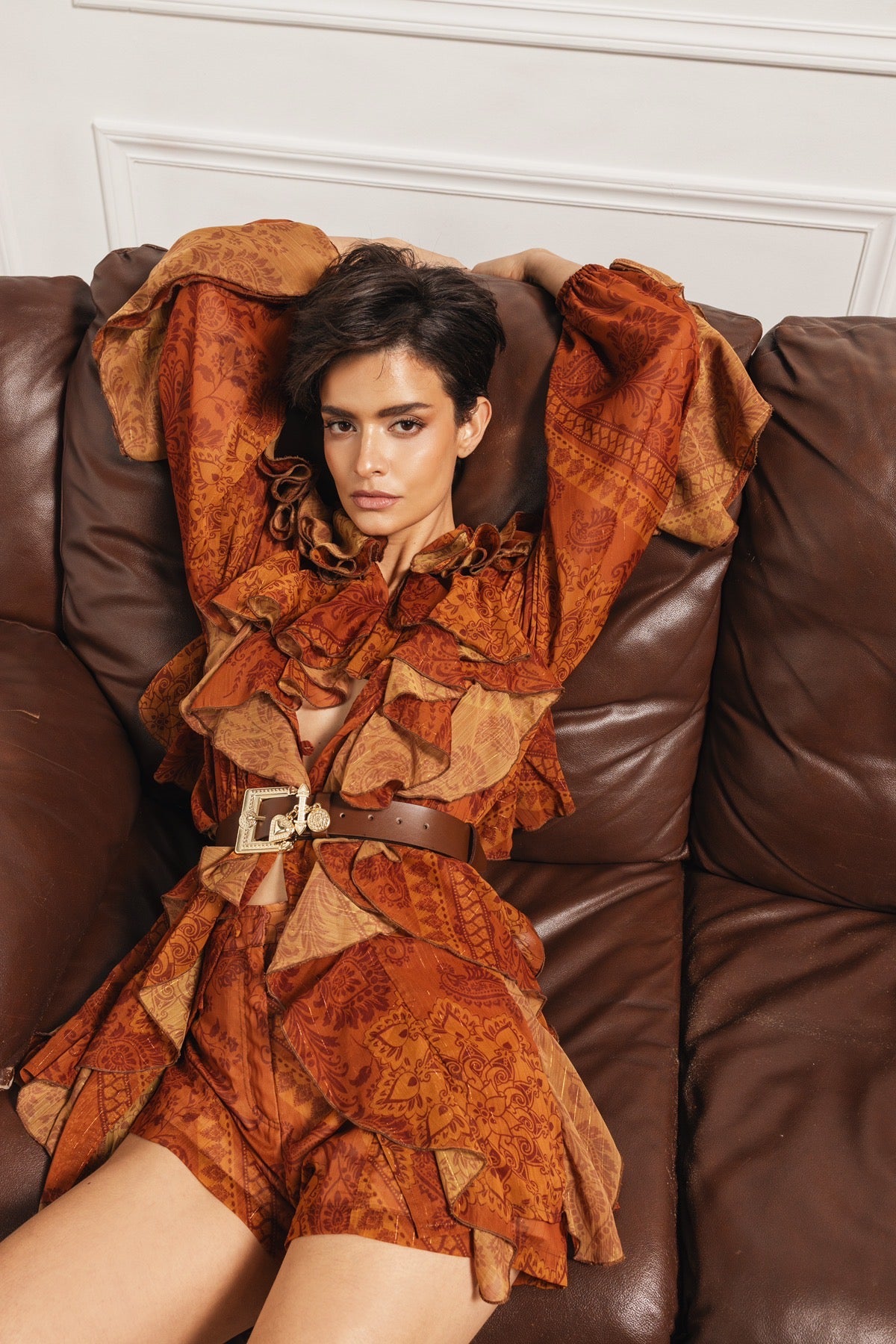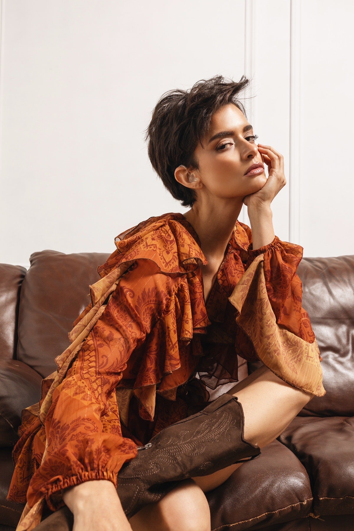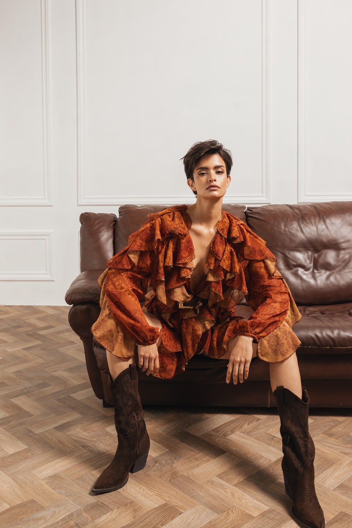 Boho-inspired blouse dress in warm earthy tones, featuring soft layered ruffles and a flowing silhouette.